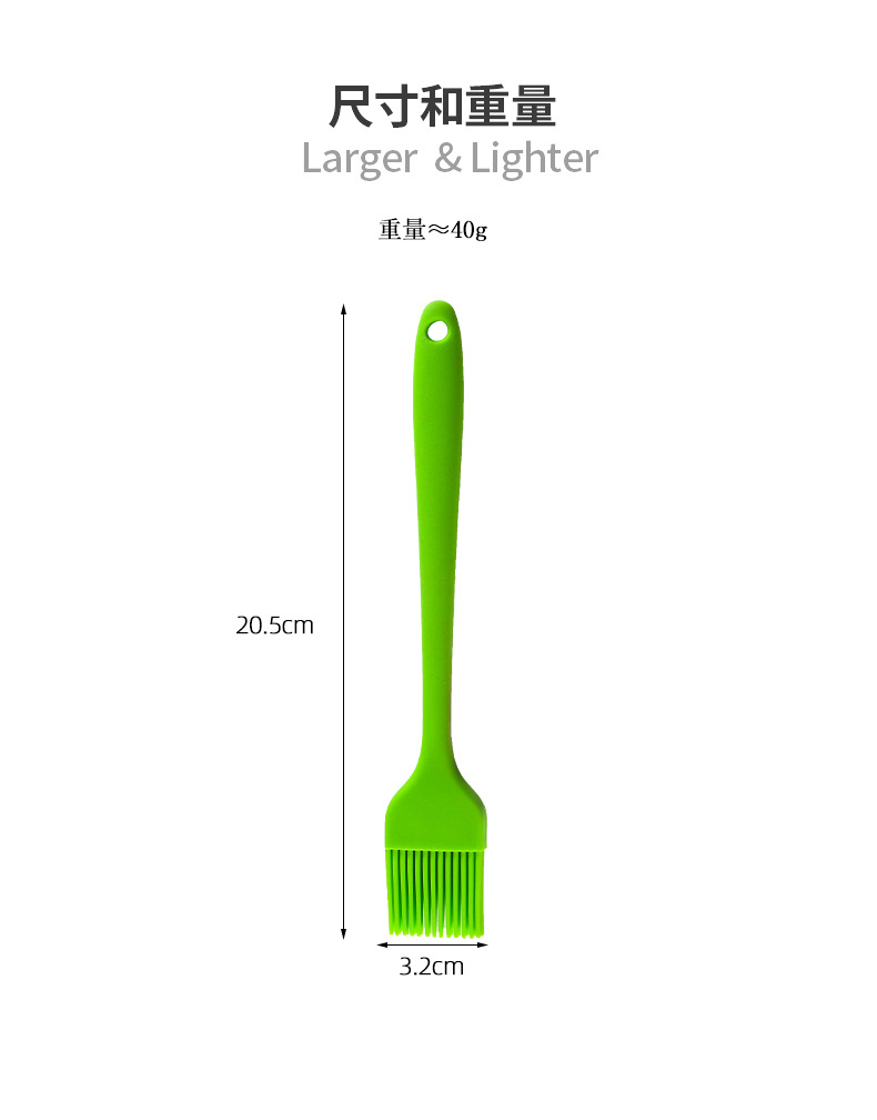 計(jì),防滑穩(wěn)當(dāng),有效加長(zhǎng)圓弧手柄的設(shè)防止被燙傷,硅膠條刷它還彈性十足,不變形,使用時(shí)不會(huì)掉落,柔軟的刷毛,密集均勻排布,能均勻的涂抹食物,柔韌性好又耐用。