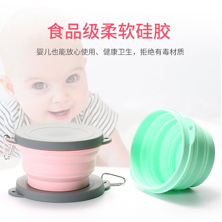 圓形帶蓋折疊飯盒硅膠碗采用食品級硅膠制成,無毒無異味,耐溫-40℃~230℃,質地柔軟耐摔,比塑料更安全,比不銹鋼更有手感,折疊不占空間,可裝牛奶、水果、餅干、方便面、酸奶等食物。