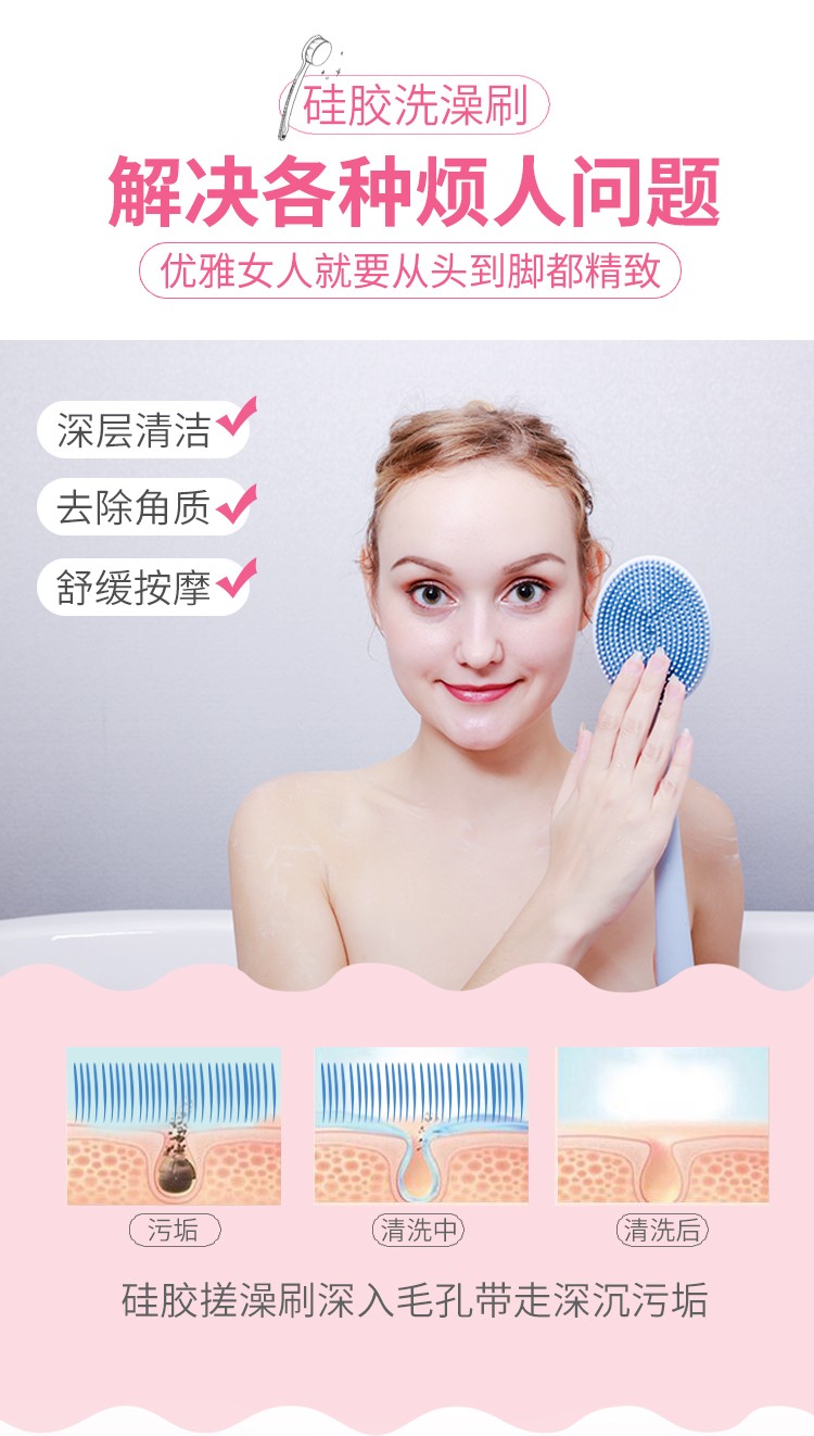 特點:硅膠材質梳毛柔軟,一體成型,易晾干,抗菌防霉,不藏污納垢,多功能雙面刷頭,一面清潔肌膚一面按摩放松。